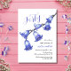 Elegant vattenfärgsblåklocksblomma gren i en vit kallelse på födelsedagen. Enkel anpassning för namn, ålder och händelseinformation till kostym efter dina behov.