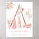 En elegant, Boho-chicen, Baby Shower Welcome Poster. På vit bakgrund dekoreras mönstret med ett trätepee tält, en elegant rosa-gardiner, rosa torkade blommor, ballonger och en kaka. Anpassa genom att lägga till ditt namn.