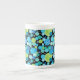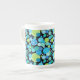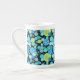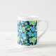 Chic Bone China Coffee Mugg, med en krånglig "Blue Måne mönster i ljusblå blues och neon grönt på svart bakgrund. En del av Posh & Painterly 'Blue Måne Samling; från en handmålad papper kollageutformning av Judy Adamson.