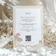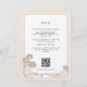 Detta sofistikerade informationskort för bröllop är designat för att ge gästerna viktiga uppgifter på ett chics- och elegant sätt. Kortet har en gräddbakgrund i riken, som utesluter en varm och inbjudande ton, som är harmoniskt parad med botaniska illustrationer som tillför lite elegans. Texten, som är väl organiserad och lätt att läsa, presenteras i ett klassiskt serif-teckensnitt som bidrar till kortets tidslösa dragningskraft. Detta kort kompletterar bröllopsinbjudan och ger gästerna perfekt om det reserverade rumsblocket och transport-arrangemang för en sömlös upplevelse. Den QR-kod som placeras på ett smart sätt i grund garanterar enkel tillgång till ytterligare information på bröllop webbplats. Detta kort är inte bara en informationsledstjärna utan också en viktig del av parets speciella dag.
