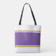 Denna moderna sportiga design har en extra bred lila horisontell rand som framhävs av flytande slanka gyllenbruna racingränder mot en ljus, skarp vit bakgrund.