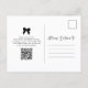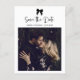 Den här eleganten och chicen, det svarta och vita bröllop spara datum-vykortet har ett modernt, visstiskt skript. Ett trendig, en svart coquette-båge och ditt favoritfoto av par finns på framsidan. På baksidan finns plats för din information om bröllop, och det finns också en QR-kod som gästerna kan söka igenom för att besöka webbplatsen för bröllop. Allt färg kan ändras, inklusive bågen och skriptet.