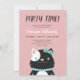 Chic födelsedagsfest inbjudan i rosa med en söt katt med turkospalthalsband och en bog, vit konetti och PARTY-tid skriven i stor svart kalligrafi brev.