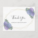 Denna vackra, eleganta boho-design har vattenfärg-buketter på framsidan med hortensiablommor i nyanser av dammig blå, ljus blåsippa, lila och lavendel-lila samt eukalyptusblad, tillsammans med en trendig geometrisk ram i guld. Inuti ramen finns den anpassningsbara texten för ditt speciella evenemang i populär handskriven kalligrafi och serif-typografi. Baksidan av kortet har genomskinliga blomsteröverlägg tillsammans med en anpassningsbar returadress, personligt meddelande och signatur för att förenkla din utskickningsprocess. Du kan anpassa den här produkten genom att ändra texten i mallen.