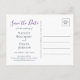 Denna eleganta och vackra dammiga blå spara-datum postkortinbjudan har blå, gröna och silvergrå akvarellbotaniker arrangerade ovanpå en vacker dammig blå bakgrund.