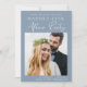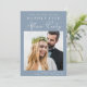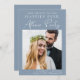 Chic dammig blå spara datum meddelande för din post-elopement eller privata bröllopsmottagning eller firande party. Framsidan har ditt foto från bröllop och "Spara datumet för vårt lyckligtvis allt efter Party" i en blandning av enkel vit typografi och ett modernt vitt skript. Lägg till ditt första datum namn och bröllop under fotot. Anpassa datummeddelandet och lägg till namn i ett namnteckning skript.