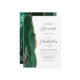 The left-hand edge of this elegant modern wedding invitation features an emerald green watercolor agate border trimmed with faux gold glitter. The customizable text combines charcoal gray script and sans serif fonts on a white background. The reverse side features a matching emerald green and gold agate design.