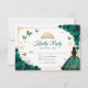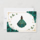 Emerald green, gold and white Quinceanera RSVP reply card. Features brunette girl in ball gown dress, script font, gold butterflies, green roses and tiara. Perfect for an elegant princess style glam celebration. Personalize with your own details.