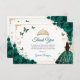 Emerald green, gold and white Quinceanera thank you card. Features brunette girl in ball gown dress, script font, gold butterflies, roses and tiara. Perfect for an elegant princess style glam celebration. Personalize with your own details.