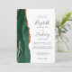 Den här elegantens lämnat kant har en modern bröllopsinbjudan och en framväxande grönt vattenfärgsagat gräns trimmad med faux guld glitter. Med anpassadet kombineras grått-handskrift, tryckplåt och kursivt typsnitt på vit bakgrund. Den omvända sidan har en matchande framväxande grönt och guld agate-design.