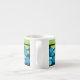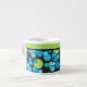 En chic Espressokaffe Mugg med ett krympt blått Måne mönster i Aqua, Turcos, Emerald Grönt, Neon Grönt och Dazzling Blue mot svart bakgrund. En del av Posh & Painterly Blue Måne-insamlingen.