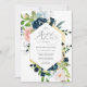 Inbjudan dina möhippa gäster i stil med den här chic anpassningsbarna blommigt inbjudningskort för möhippan med handmålade havsblått och rosa vattenfärg rosor med grönt och modernt svart skript. Anpassa alla duschdetaljer i svart typografi. Kortets baksida har en vattenfärg struktur. Designad av Susan Coffey.