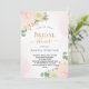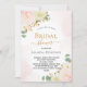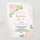 En ljus och mejerie Inbjudningskort för möhippan. En vit bakgrund med mjuk vattenfärgspenselbakgrund för rosa. Dekorerad med vattenfärgade blommor, blommigt rosa ros, vita orkidéer och en färgad gerbera, eukalyptus greenery och faux guld sprigs. Anpassa och lägg till bridens namn för att vara och närmare party. Svart och guldfärgad färgad brev.