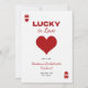 The “Lucky in Love” bachelorette itinerary invitation is a modern, minimal, and funky design that channels trendy Las Vegas casino vibes for the ultimate girls’ getaway; the front resembles a chic poker card with a bold red heart at its center, set against a crisp white background with stylish red typography, while the back flips to a vibrant red canvas featuring hand-drawn wine glasses adorned with coquettish bows, where the weekend details are elegantly displayed—perfectly blending fun, fashionable energy with a playful nod to the thrill of the casino.