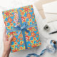 En rulle av mycket snyggt Wrapping Papper, med mönster mönster av rött, orange, gula blommor på en ljus turkobakgrund, från en handmålad papper kollage av Judy Adamson.