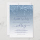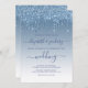 En chic, modern design med en blå ombre-bakgrund med en blå gräns av blå glitter-droppar. Ord "bröllop" och parets första namn visas i gemener med kalligrafiskript med dekorativa dekorativa dekorationer i början och slutet, med den återstående texten i sans serif-teckensnitt. Bakgrunden till den blå bubblan och glitter drip gräns upprepas på motsatt sida. (Om du vill behålla dekorationerna ersätter du bara brev och lämnar symbolerna i ställe.)
