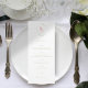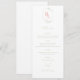 Chic och färsk med unga undertoner. Den här mallen innehåller 3 kurser och drycker, tillsammans med ett blommigt monogram med ett par initialer högst upp på kortet. Färg omfattar korallets rosa, grönt och vita. Kortets baksida har lämnats vit.