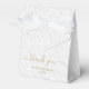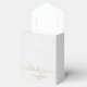 Elegant vit på vit filigree-utskrift mönster med namn och tack i chic guld-utskriften på framsidan. Dessa plakat för festen tält stil är vackra för bröllopsfavoriter, möhippor eller något speciellt tillfälle.