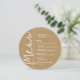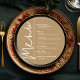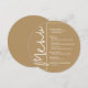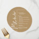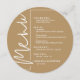 Ett runt guldfärgat menykort med dina menyval i chic vit text, perfekt för en modern bröllopsmottagning, bröllopsrepetition, årsfest eller någon speciell tillställning med en sittande middag. Anpassa enkelt med dina middagsval och detaljer. FLER färger i vår butik.