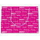 Hot pink name collage birthday gift bag decorated in nine different fonts spelling a custom name in white. Chic personalized girly gift wrap with fun typography.