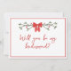 Minneshögtiden i kärlek och glädjen med det här jultema-frieri kortet! Med en charmerande röd båge, delikata gröna accenter och typsnitt för elegant kombinerar det här kortet på ett vackert sätt helgdag med den upphetsning du känner under speciell dag. Perfekt för att be dina brudar att stå vid din sida i stil, är den här designen anpassade och tillför lite helgdag till dina bröllop-planer. Perfekt för jultemat bröllop eller brudens sida under vintern kommer detta kort att göra er frieri stund oförglömlig.