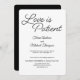 Chic, trendig, elegant, svart-vit bröllopsinbjudan. Denna design har en modern stil för orden "Kärlek är tålig" typografi. Anpassa detta bröllopsmeddelande som dubblar som en bröllopsinbjudan med brudens och brudgummens namn och all information om bröllopsfesten och vigseln. Denna moderna och eleganta layout är lätt att anpassa.