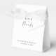 En förmånslåda för chicens minimalistiska bröllop med "Kärlek + tack" i ett modernt skript och elegant-serif-typografi, ditt namn och bröllop-datum.