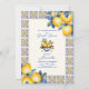 Temat inbjudningskort för möhippan, där citroner, citroner och blommar och mönster i Medelhavsbrickan visas i vattenfärg. Anpassa genom att lägga till namn, datum, tid och annan information. Denna citron inbjudningskort för möhippan är perfekt för sommartemat bröllop och möhippor kring Medelhavet.