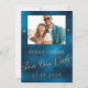 Modern trendig bröllop Spara Vårt Date-handskriftsskript av kopparkoppar i glitter och ditt anpassningsbar-foto över en mörk blått tvättat vattenfärgsbakgrund guld ett lyxglam skapar elegant bröllop-kort. +++++++++++++ Enkel att anpassa med ditt favoritfoto och information på båda sidor!
