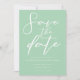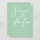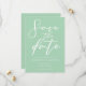 Den här mjuka mint-grönten Spara datumkortet har chic vit typografi för en söt utomhusceremoni i vår. Ett enkelt skript och elegant på en stillastående, solid pastel grönt inbjudan för en trädgårdsplats.