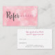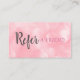 Ett chic modernt rosa-referenskort med söt rosa bokeh som bakgrund med elegant typografi. Perfekt för ett stort antal yrken inklusive: skönhetare, hår- och skönhetskonsulter, stilister, makeup artists och spas till namn några få! Anpassa genom att lägga till din kontaktinformation på motsatt sida med ditt speciella rabatterbjudande. Designad av Thisisnotme©
