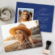 Det här studenten-meddelandet med utfall i fullt har ett kalligrafiskript i chic hälsning i vitt. Med den här eleganten och den moderna designen kan du visa fotot genom att hålla informationen så liten som möjligt. **inslag på baksidan (text, foto osv.) kan enkelt tas bort om det inte behövs.** All färg (text och färg i bakgrunden) kan också anpassas med hjälp av verktyg.
