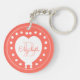 Den här nyckelringen har en korallbakgrund med ett punktomringat vitt hjärtcentrum och ett första monogram för namn och brev. Anpassa texten fält med förnamn eller efternamn och ursprunglig, ta bort en eller båda texterna eller klicka på anpassa för att välja ett teckensnitt stil, storlekt och färg som du vill använda. Om du vill att hjärtat och prickarna i ett visst färg ska samarbeta med dig, kontaktar du mig på theaspenstand@hotmail.com .