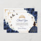 Navy, gold and white Quinceanera thank you card. Features brunette girl in ball gown dress, script font, gold butterflies, roses and tiara. Perfect for an elegant princess style glam celebration. Personalize with your own details.