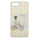 Chic och moderna, personliggåvor och tillbehör med en elegant flicka som rider en cykel med den Eiffel handduken i bakgrunden. Dekorerat med enfärgad polka pricka mönster.