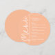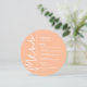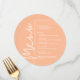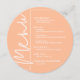 Ett runt menykort för middagen i peachfärg presenterar dina menyval i chic vit text, perfekt för en modern bröllopsmottagning, bröllopsrepetition, årsfest eller någon speciell tillställning med sittande middag. Anpassa enkelt med din middagsmeny och detaljer. FLER färger i vår butik.