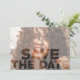 Fotot med en SPARA DATE-övertäckningen på framsidan och information om din studentfest som bjuds in på baksidan med ett nytt eller samma foto.