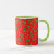 En vit kaffe Mugg, med Grönt Lip and Handle och mönster av vallmo Buds på Scarlets bakgrund, som du kan ändra om du vill. Del av insamlingen "Poppy Fält". (mönster kommer att passa in i hela mugg)