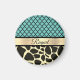 En chic quatrefoil mönster på en turkospaus tillsammans med ett guld-band för personanpassning och under det är en snyggt giraffe för animaliska exotiska vibes.