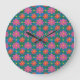 En söt Rund akrylväggsklocka, med ett färglöst mönster av Röda och Rosa Blommor och Gult Polka dots på djupblå och Grönt bakgrund. En del av Posh & Painterly 'Rangoli'-samlingen kan ställas in i mönster så att det passar alla väggklossar.
