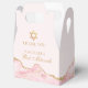 Chicens rosa och guld agate dekorerar denna moderna Bat mitzvah partiaffär. Din dotters namn är skriven i ett vackert högtidligt skript under David stjärna. Söt föredrar lådor för en modern judisk familj som firar en flicka som kallas till Torah.
