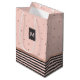 Elegant presentpåse i allmänt syfte gjord i en rosaktig beige, med rosa guld prickar, på den övre halvan av påsen och ett svart och rosaktigt beige randigt mönster, på botten. Grafik av ett rosa guld folieband löper tvärs över mitten av påsen, och en grå och rosa guld rektangel textarea, pryder mitten fram på påsen. En rosa enkel bokstavsmonogram på framsidan av presentpåsen är redo att anpassas.