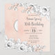övertoningsbakgrund för rosa i chic, dekorerad med delikat, och modern skiss av stil vit blommigt arrangemang i det övre högernas hörn och grund lämnat hörn. Teckensnittskombination av elegant calligraphy och serif typography on charcol för information om födelsedagsinbjudan. Baksidan av inbjudan har samma blommigt med ett medaljontypsmonogram med födelsedagsflickornas kalligrafi i initialer elegant.