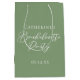 This elegant sage green bachelorette party gift bag features classic white script for a bride who is going to have an outdoor event with her bridesmaids. A chic, minimalist bachelorette party design for bridesmaid gifts.