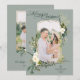 botanisk helgdag för chic och elegant med en ljusbågformad fotomall av anpassningsbar med tunn glatt guld-linje som är accentuerad med sprejer av blommor, bär, gräns och evergreens i vit, guld och grönt på bakgrunden till pastellsage. Innehåller redigerbar fält och valfri raddelare. Baksidan innehåller ytterligare en fotomall och fält.