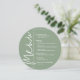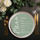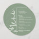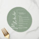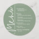 Ett runt menykort i sagegrön färg med dina menyval i chic vit text, perfekt för en modern bröllopsmottagning, bröllopsrepetition, årsfest eller någon speciell tillställning med en sittande middag. Anpassa enkelt med dina menyval och detaljer. FLER färger i vår butik.