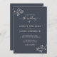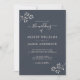 Elegant, modern och enkel bröllopsinbjudan med kalligrafi av elfenbensskript och en snyggt av löv av elfenbensblommar på mörk blått bakgrund. Lägg bara till dina uppgifter om bröllop. Enbart designad för dig av Lycklig Dolphin Studio. Om du har några frågor, kontakta oss genom vår chatta. Vi är lycklig för att hjälpa dig att göra bröllop till den vackraste dagen!