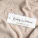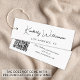 Elegant och chic skräddarsydd klänning, accessoarer, smycken, boutique med mera, vit upphängningsetikett med minimalistisk stil med ditt namn eller varumärke i ett stilfullt signaturskript och ytterligare text nedan om så önskas i modern enkel typografi. På baksidan läggs ytterligare text till och en URL-adress anges för att skapa en skannbar QR-kod som är kopplad till din webbplats, portfolio, profil på sociala medier eller någon annan plattform som visar ditt arbete och dina produkter, vilket gör det enkelt för kunder att utforska ditt varumärke. Observera att Zazzle inte stansar hål.
