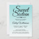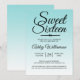 En chic Havsblått snäcka-formgivning Söt 16-födelsedagsinbjudan. Den ljusblå tonen tonas till en vit bakgrund. Texten "Sweet sixteen" i svart står i modernt skript. Färg rosa citonad används för detta ändamål. Elegant 16:e födelsedagsfest inbjudan för en glamorös Sweet sixteen, perfekt för henne, den modet som kärlek modern mönster, lyx och glam med ett sommarstrandtema. Enbart designad för dig av Lycklig Dolphin Studio.