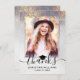 Skicka ett foto av chic anpassningsbar studenten tack för ditt kort till din familj och dina vänner för deras generösa support. Den här moderna designen har bild på framsidan med en övertäckning av svartskripttypografi som visar "Tack" accentuerad av ett svart graderingshölje med ditt namn och år för att anpassa sig efter faux silver med guld-gnistor och glitter. Kortets baksida har ett andra foto med ett tackmeddelande och namnteckning anpassa. Gratulerar på studenten! Designad av Susan Coffey.